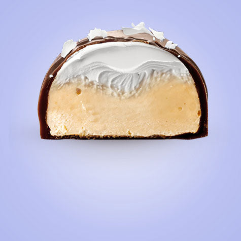 Luftig vaniljkräm och mjuk proteindeg, omsluten av krispig mörk choklad, strödd med fina kokosflingor.
